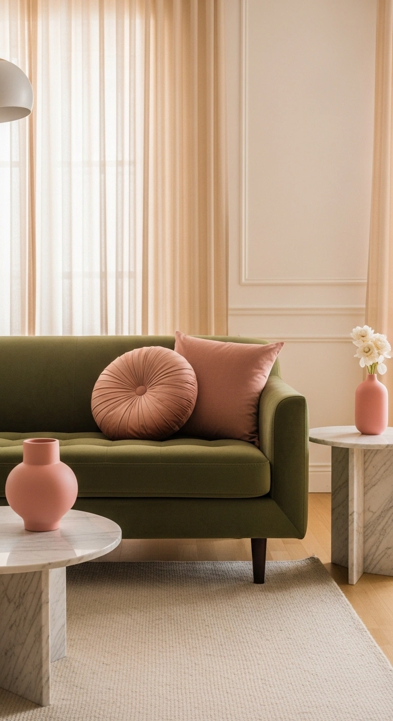 A green couch paired with blush accents creates a soft and romantic living room. The gentle pink tones contrast beautifully with green. Add blush throw pillows and a light pink vase. Keep walls neutral to let the colors shine. Choose gold accents for a subtle touch of glamour. A cream rug balances the palette. The room feels warm and inviting.