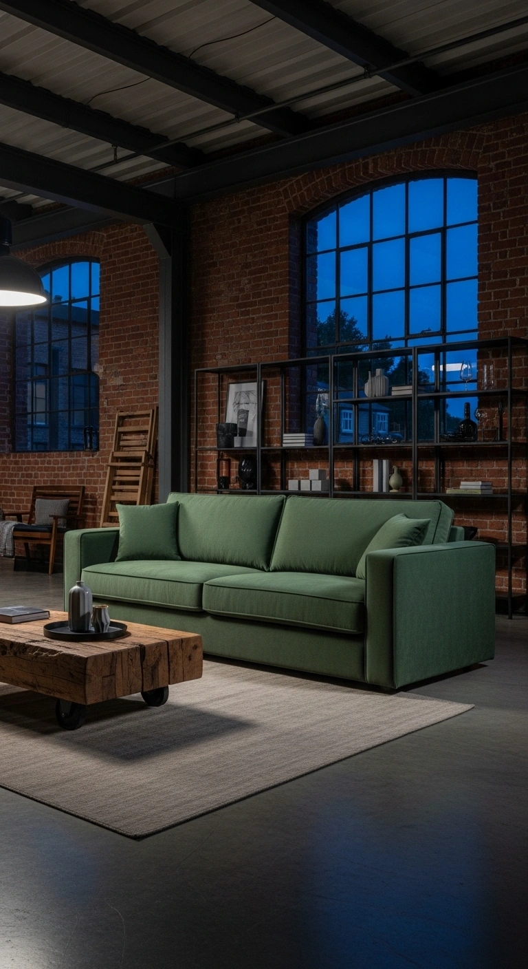 A green couch stands out beautifully in an industrial loft setting. The rich tone contrasts against exposed brick and concrete walls. Add black metal shelving and a reclaimed wood table. Keep lighting bold with industrial-style fixtures. A neutral rug softens the raw textures. The mix of soft fabric and hard surfaces creates balance. The space feels edgy yet comfortable.
