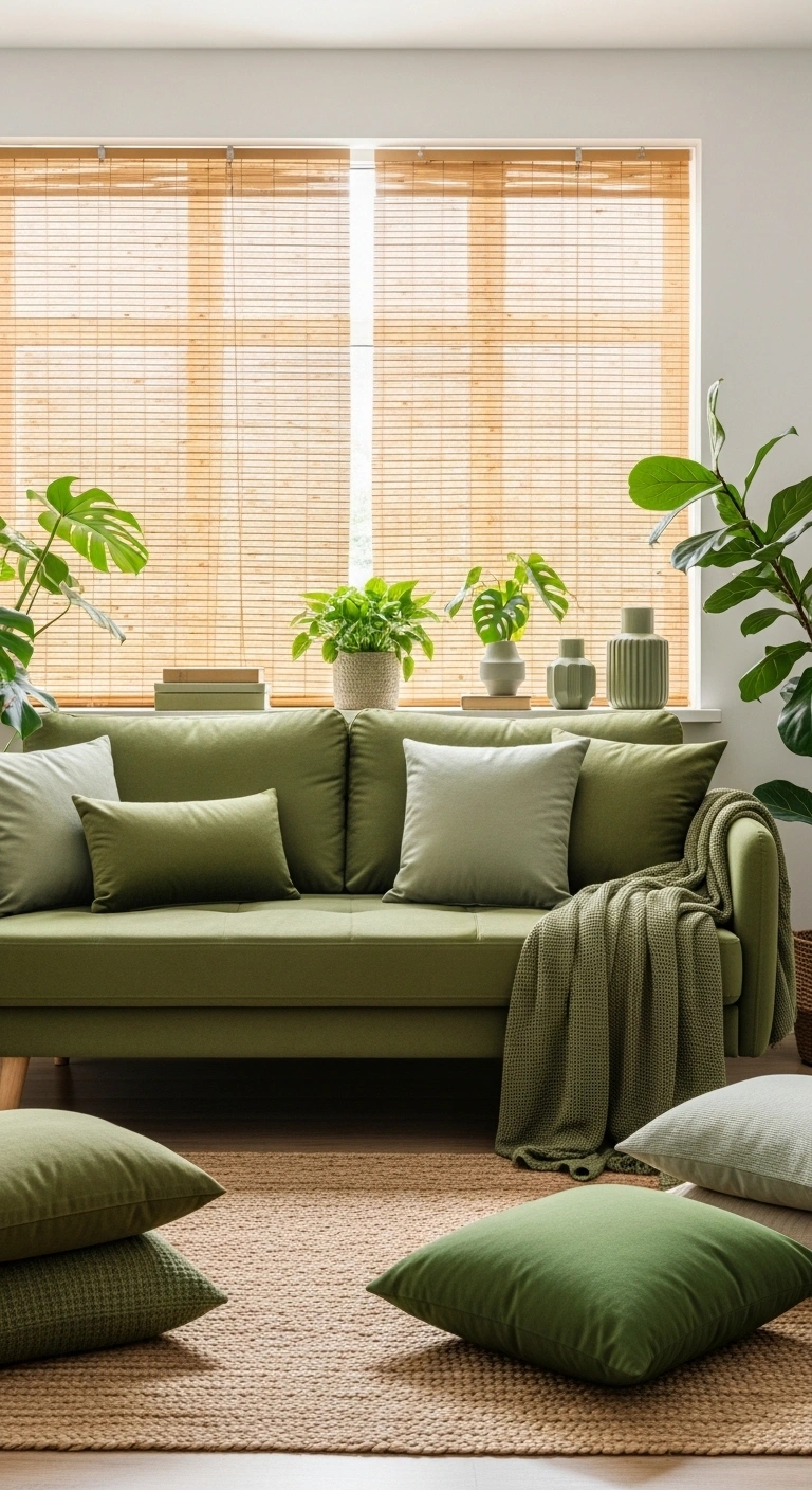 To style this look, vary textures so the greens do not blend together. Combine velvet, linen, and cotton fabrics. Use plants to add organic variation. Keep furniture shapes simple and clean. Add wood or brass for warmth. Avoid adding strong contrasting colors. This idea works beautifully in calm and nature-inspired homes.