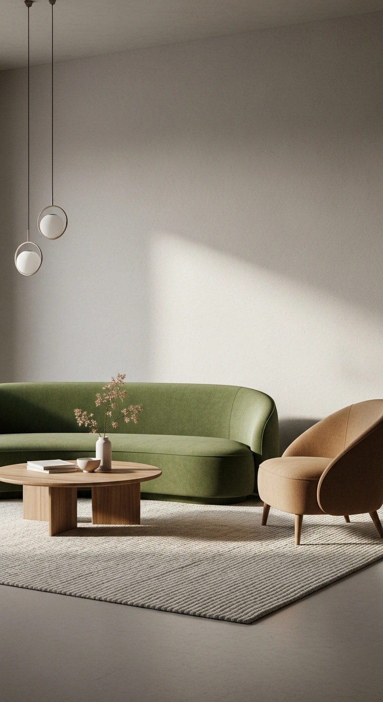 A green couch feels modern when paired with curved furniture shapes. Choose a sofa with soft rounded arms if possible. Add a round coffee table and curved accent chair. Keep the color palette light and balanced. A textured rug enhances the softness. Warm lighting highlights the curves beautifully. The room feels contemporary and fluid.