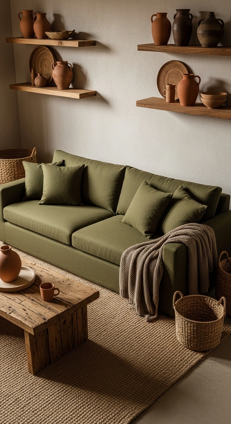 An olive green sofa brings a relaxed and grounded feel to a living room. Its muted tone feels calm and natural, making it perfect for cozy spaces. Pair it with terracotta pots, woven baskets, and a jute rug to build texture. Light cream or sandy beige walls help the olive shade feel fresh instead of heavy. Add linen curtains and soft cotton throws for a layered look. Wooden shelves with handmade ceramics enhance the earthy mood. The overall vibe feels warm, organic, and welcoming.