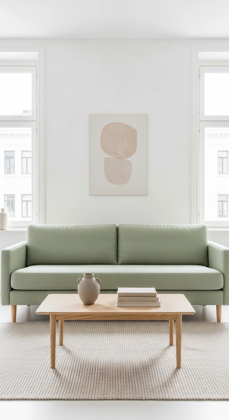 A sage green couch creates a soft and airy living room with a modern minimalist feel. The muted green tone feels peaceful and easy on the eyes. Pair it with white walls, pale wood floors, and simple black accents for contrast. Choose sheer curtains to let in plenty of daylight. A low-profile coffee table keeps the space feeling open and clean. Add one abstract art piece above the sofa to maintain simplicity. The atmosphere feels fresh, light, and uncluttered.
