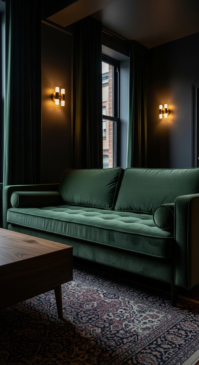 A dark green velvet couch paired with moody walls creates a dramatic and sophisticated living room. Deep charcoal or forest green walls enhance the richness of the velvet texture. Add gold or brass lighting fixtures to bring warmth and shine. A dark wood coffee table adds depth and weight to the space. Layer with a patterned rug in muted tones to soften the bold palette. Soft lighting from table lamps creates a cozy evening glow. The room feels intimate, stylish, and bold.