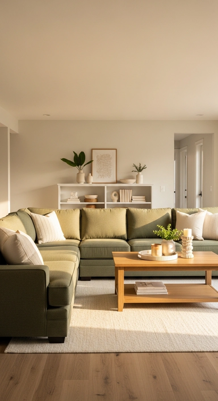 A green sectional sofa brings comfort and style into an open living space. The larger shape makes the room feel inviting and functional for family gatherings. Pair it with cream walls and warm wooden furniture for balance. A chunky knit throw adds softness and texture. Choose a large neutral area rug to anchor the seating zone. Light oak shelving keeps the room bright and airy. The overall look feels modern yet cozy.