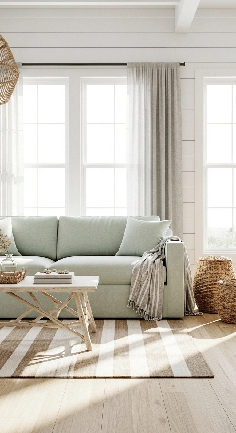 To style this look, keep colors light and airy. Use slipcovered furniture for a relaxed feel. Choose light wood or whitewashed tables. Add linen throw pillows in soft blues or creams. Place the sofa near windows to maximize daylight. Use subtle nautical elements instead of obvious decor. This idea works perfectly in homes that embrace natural light and simplicity.