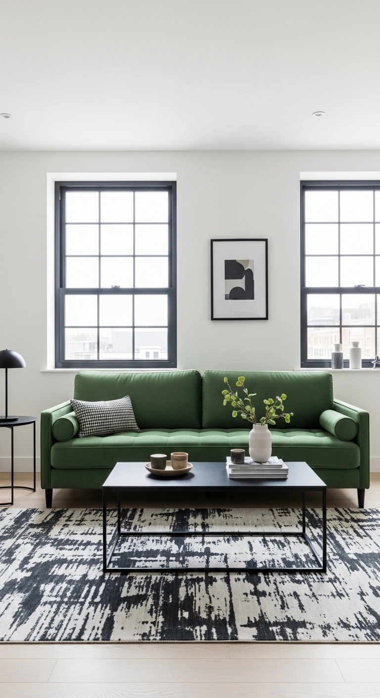 A green couch pops beautifully in a black and white living room. The bold color becomes the central statement against a monochrome backdrop. White walls keep the space clean and bright. Black metal lighting fixtures add modern contrast. A graphic black and white rug anchors the room. The green tone feels fresh and modern in this setting. The atmosphere looks bold yet balanced.