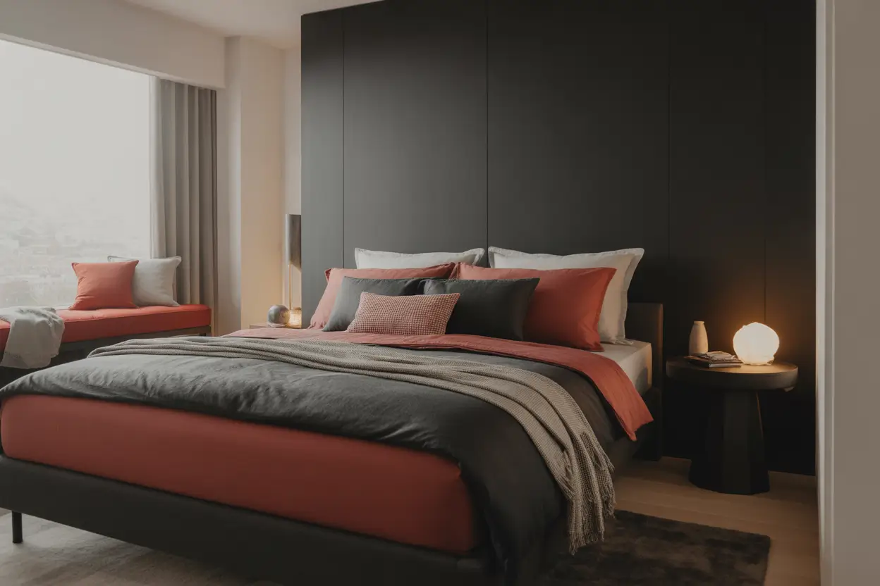 Focus on placing these fabrics where your eye naturally lands, such as the bed and a nearby chair. Keep the floor area lighter with a soft grey or muted rug to balance the heaviness of the walls. Add warm bedside lighting so the red tones glow softly instead of appearing too bold. This approach works because it spreads color in layers rather than blocks, which makes the room feel rich, cozy, and visually interesting without becoming overwhelming.