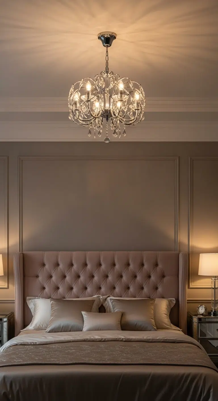 A refined chandelier or pendant light adds glamour and height. Glass, crystal, or brushed brass finishes reflect light softly. The fixture becomes a subtle focal point. Even small rooms feel elevated with the right overhead detail. Light spreads evenly across the space. The atmosphere feels warm and inviting.