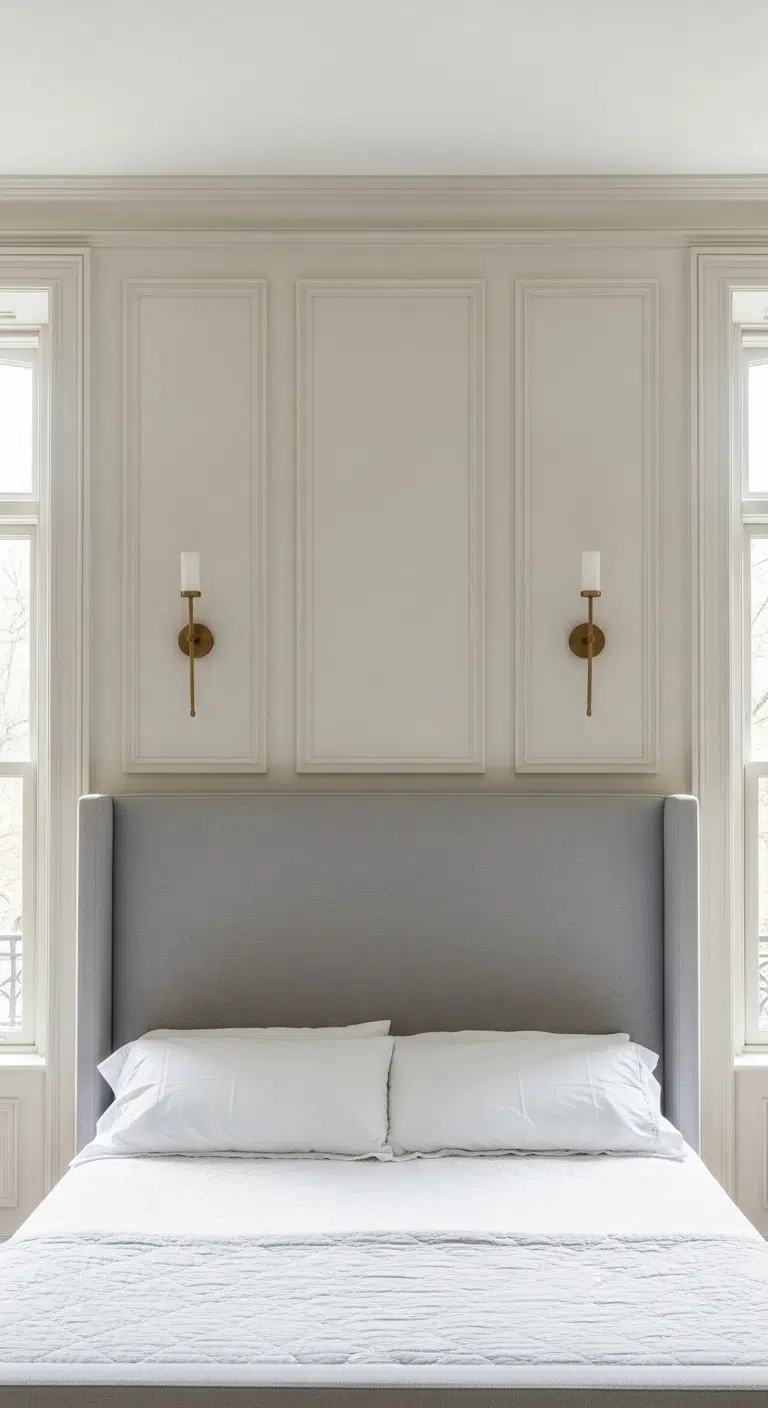 To apply this idea, install simple box molding evenly spaced behind the bed. Paint the molding and wall the same shade for a seamless look. Use satin or matte finishes to avoid shine. Pair the wall with minimal artwork so the detailing remains visible. Add soft sconces to highlight the texture at night. This approach creates a timeless hotel-inspired backdrop.