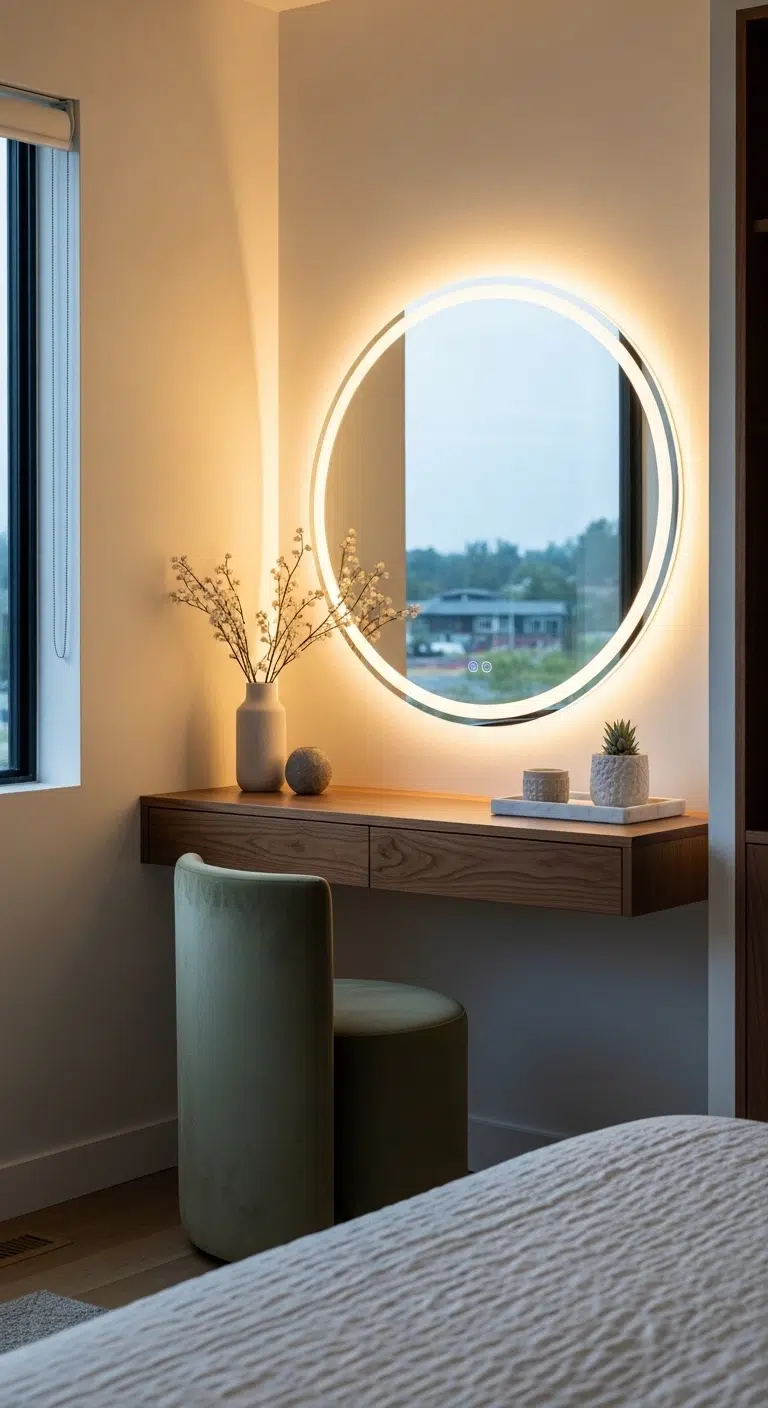 A small vanity setup adds boutique charm to a hotel-style bedroom. A sleek console table paired with an upholstered stool feels elegant. A round mirror with soft lighting enhances the glow. The area feels purposeful and refined. It creates a daily ritual space. The bedroom feels complete.