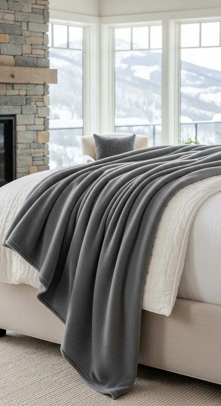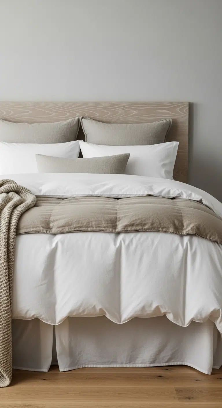 A plush throw blanket adds instant warmth and depth. Materials like cashmere, faux fur, or chunky knit feel inviting. Draped casually at the foot of the bed, it softens sharp lines. Neutral tones maintain harmony. The layered texture enhances visual interest. The bed looks fuller and more luxurious.